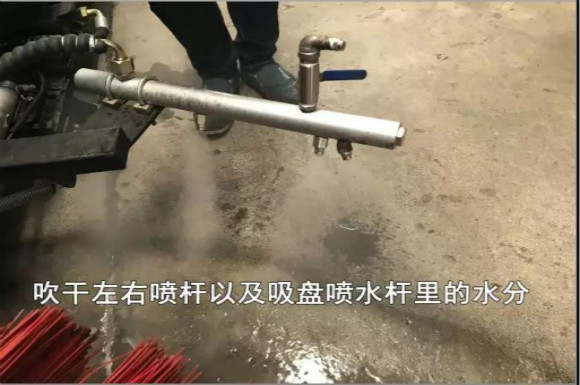 4.啟動底盤發(fā)動機,采用氣吹水,吹干滯留在左右噴桿、吸盤噴水桿、后噴霧桿里的水分